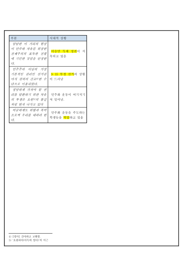 | 비굴하게도 위협과 폭력으로써 우리를 대하려 한다. | 민주화 운동을 주도하는 학생들을 억압하고 있음 |