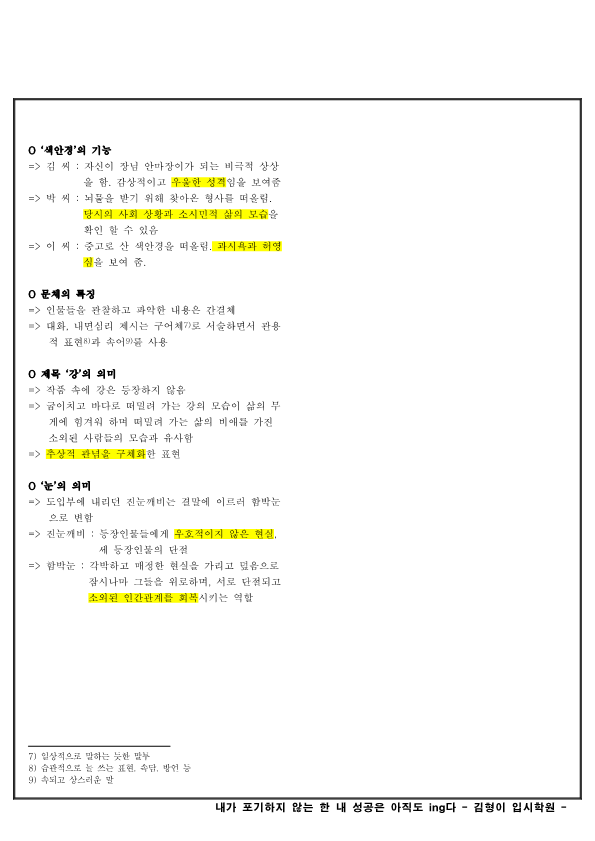 ③ 인물들의 사소한 삶의 경험과 좌절된 꿈의 현주소 를 각 인물들의 시점으로 서술