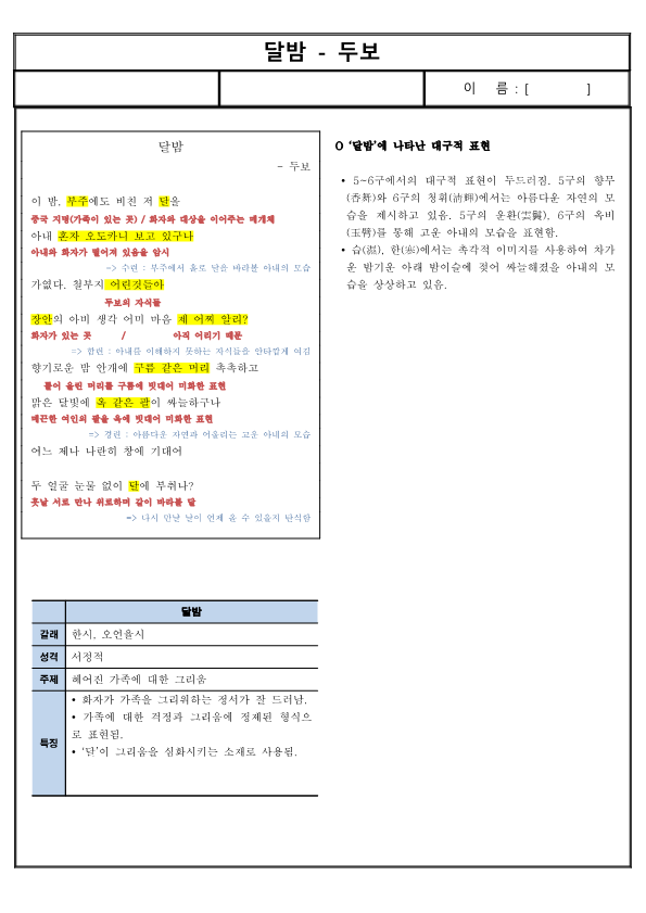 | 특징 | 화자가 가족을 그리워하는 정서가 잘 드러남. 가족에 대한 걱정과 그리움에 정제된 형식으로 표현됨. ‘달’이 그리움을 심화시키는 소재로 사용됨. |