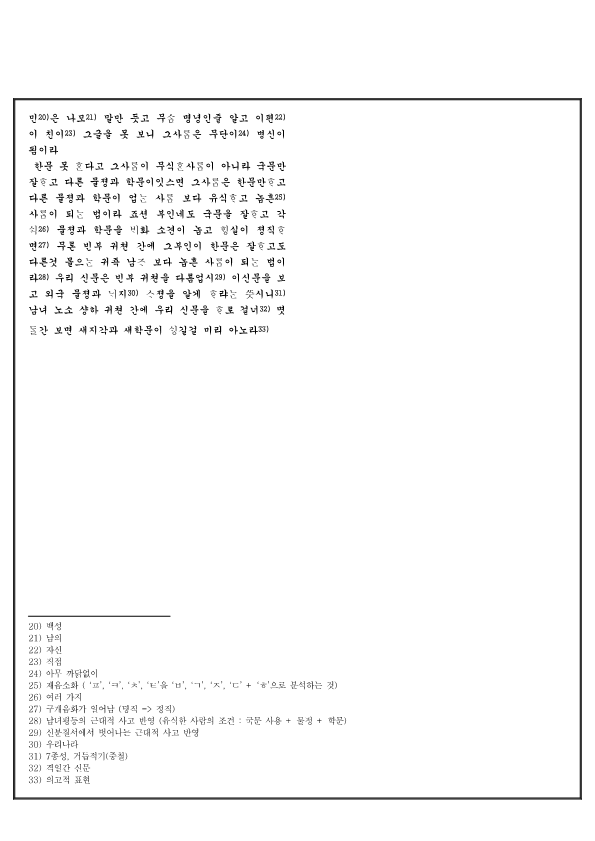 국문을 알아보기가 어려운건 다름이 아니라 쳣 말마을 이지 아니고 그져 줄줄려 쓰 에 글가 우희 부터지 아 부터지 몰나셔 몃번 일거 본후에야 글가 어 부터지 비로소 알고 일그니 국문으로 쓴편지 쟝을 보자면 한문으로 쓴것보다 더듸 보고 그나마 국문을 자조 아니 쓴 고로 셔툴어셔 잘못봄이라 그런고로 졍부에셔 리 명녕과 국가 문젹을 한문으로만 쓴즉 한문못 인민은 나모 말만 듯고 무 명녕인줄 알고 이편이 친이 그글을 못 보니 그사은 무단이 병신이 됨이라