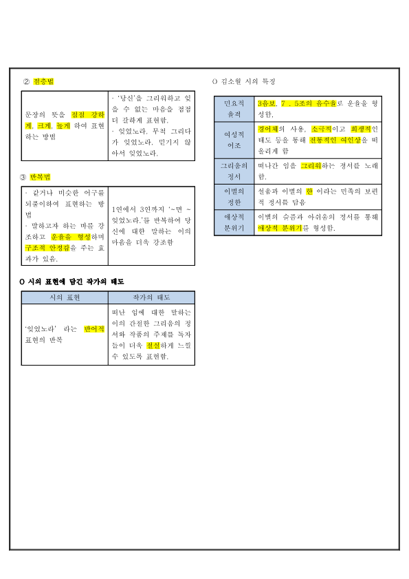 | 문장의 뜻을 점점 강하게, 크게, 높게 하여 표현하는 방법 | · ‘당신’을 그리워하고 잊을 수 없는 마음을 점점 더 갈하게 표현함. · 잊었노라. 무척 그리다가 잊었노라. 믿기지 않아서 잊었노라. |