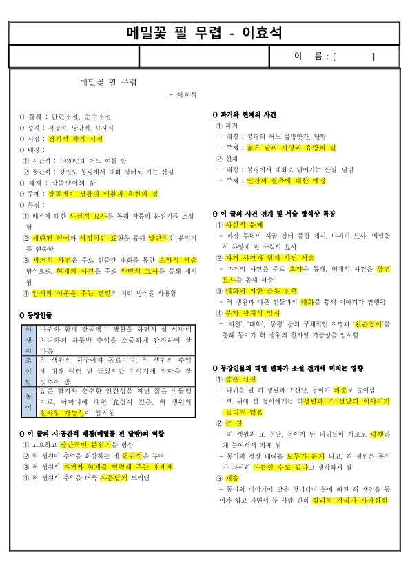 | 허 생원 | 나귀와 함께 장돌뱅이 생활을 하면서 성 서방네 처녀와의 하룻밤 추억을 소중하게 간직하며 살아옴 |