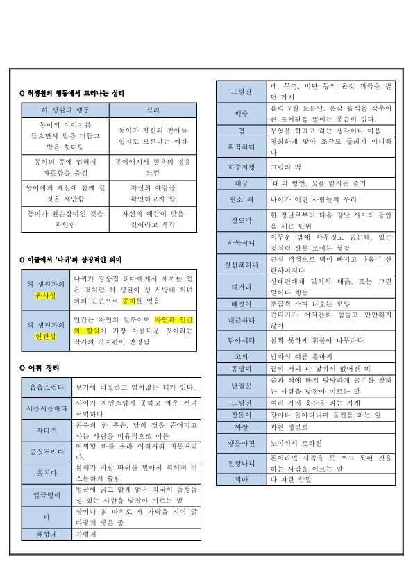 | 허 생원과의 연관성 | 인간은 자연의 일부이며 자연과 인간의 합일이 가장 아름다운 것이라는 작가의 가치관이 반영됨 |