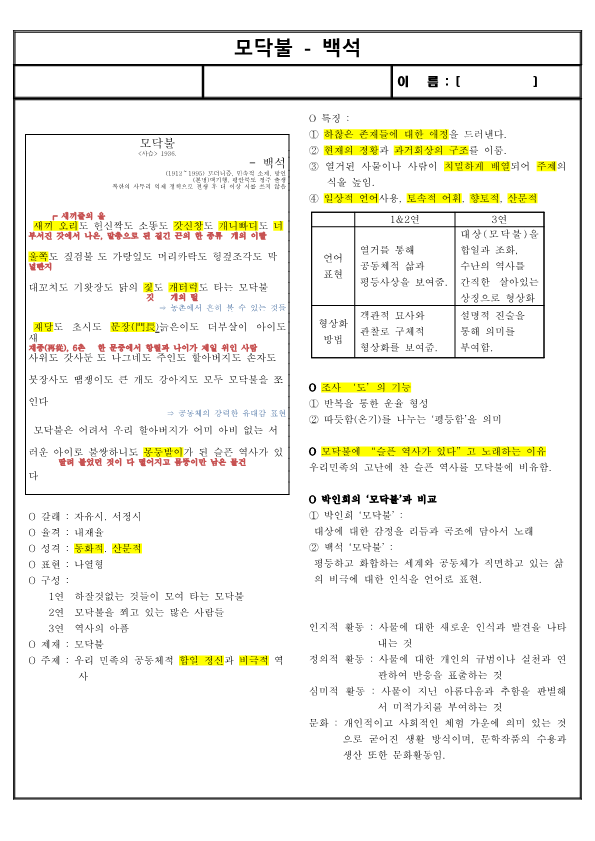 | 형상화 방법 | 객관적 묘사와 관찰로 구체적 형상화를 보여줌. |