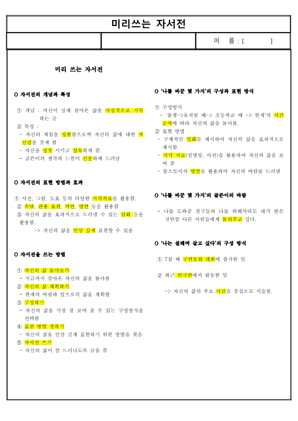 - ‘출생->유치원 때-> 초등학교 때 -> 현재‘의 시간 순서에 따라 자신의 삶을 돌아봄.