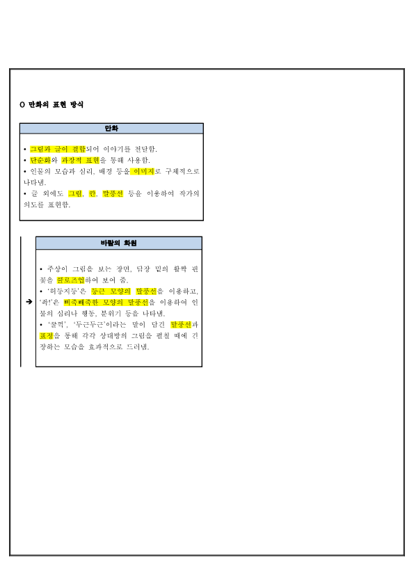 | 그림과 글이 결합되어 이야기를 전달함. 단순화와 과장적 표현을 통해 사용함. 인물의 모습과 심리, 배경 등을 이미지로 구체적으로 나타냄. 글 외에도 그림, 칸, 말풍선 등을 이용하여 작가의 의도를 표현함. |
