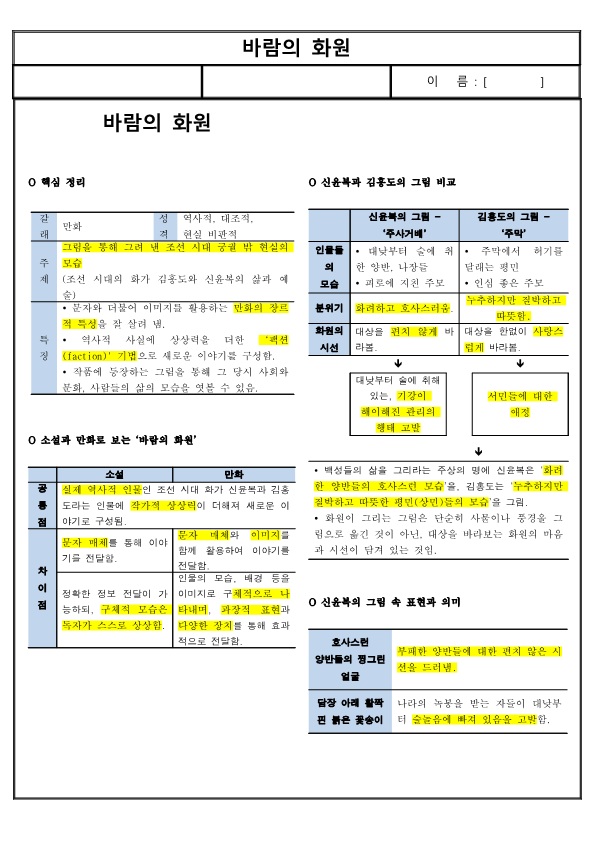 | 주제 | 그림을 통해 그려 낸 조선 시대 궁궐 밖 현실의 모습 (조선 시대의 화가 김홍도와 신윤복의 삶과 예술) |