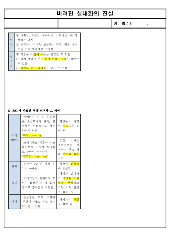 | 자막 | 운동장을 보여 주면서 ‘부산의 어느 학교’라는 자막을 삽입함. | 이야기의 배경을 알려 줌. |
