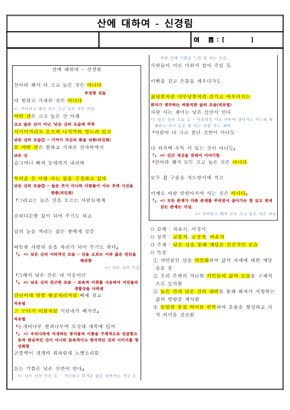 『』 => 낮은 산의 친근한 모습 - 토속적 어휘를 사용하여 서민들의