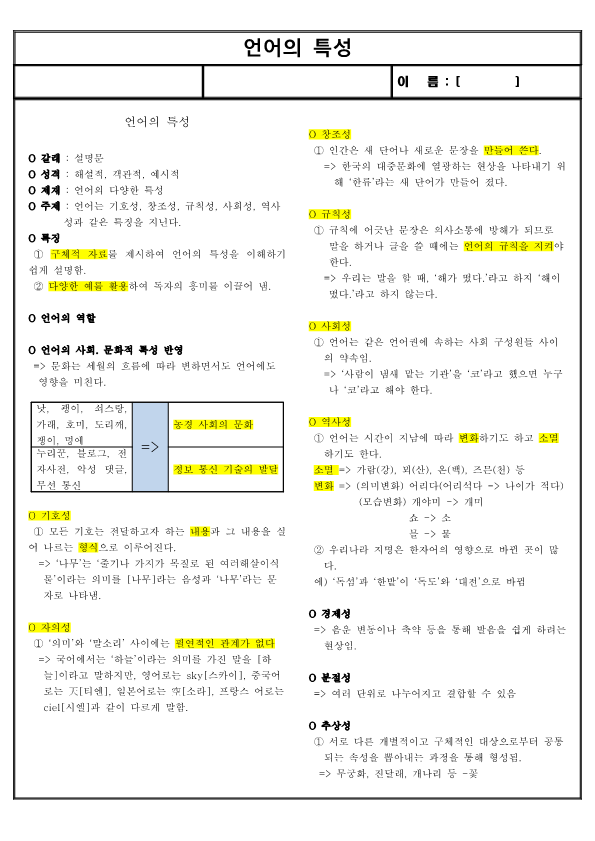 O 주제 : 언어는 기호성, 창조성, 규칙성, 사회성, 역사