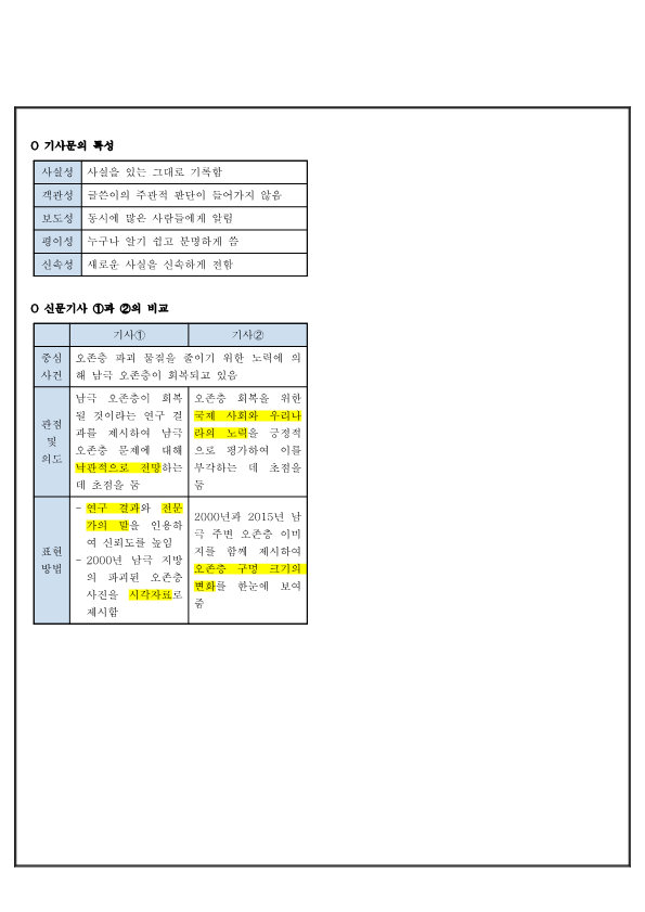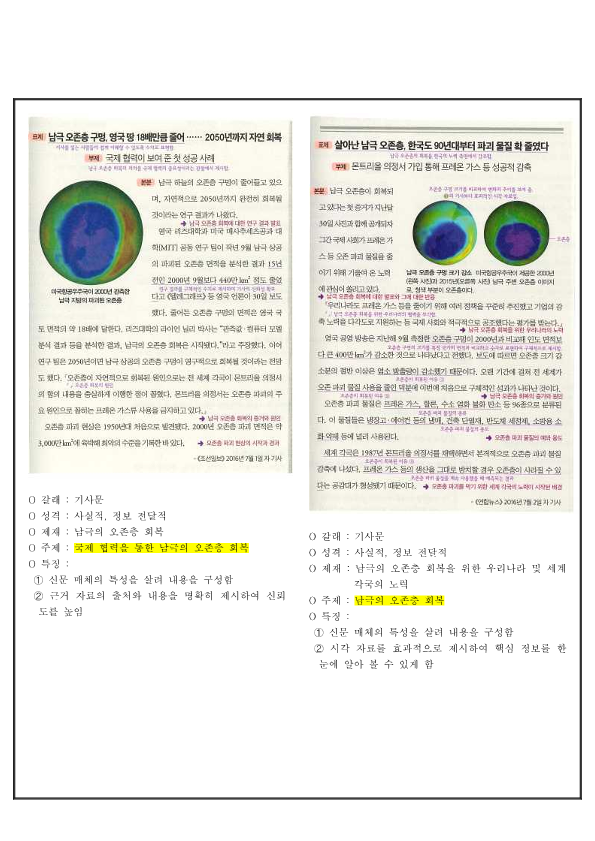 | 관점 및 의도 | 남극 오존층이 회복될 것이라는 연구 결과를 제시하여 남극 오존층 문제에 대해 낙관적으로 전망하는 데 초점을 둠 | 오존층 회복을 위한 국제 사회와 우리나라의 노력을 긍정적으로 평가하여 이를 부각하는 데 초점을 둠 |
