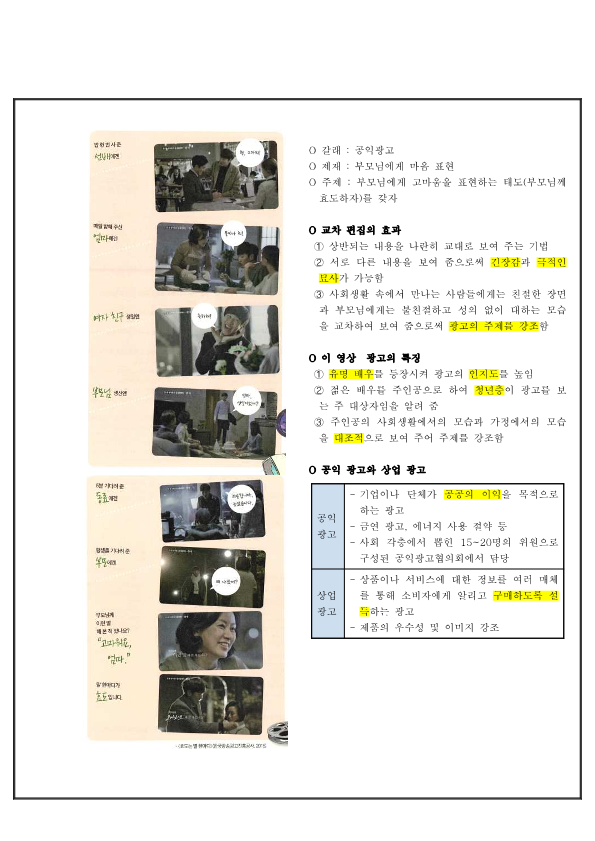 ➂ 사회생활 속에서 만나는 사람들에게는 친절한 장면과 부모님에게는 불친절하고 성의 없이 대하는 모습을 교차하여 보여 줌으로써 광고의 주제를 강조함
