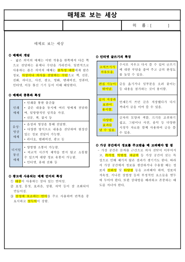 | 인쇄 매체 | • 인쇄를 통한 출간물 • 같은 내용을 동시에 여러 명에게 전달하며, 일방향적인 성격을 가짐. • 신문, 책, 잡지 등 |