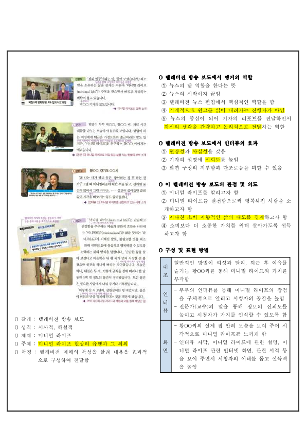| 화면 | 황OO씨의 실제 집 안의 모습을 보여 주어 시각적으로 미니멀 라이프를 느끼게 함 인터뷰 자막, 미니멀 라이프에 관한 설명, 미니멀 라이프 관련 인터넷 화면, 관련 서적 등을 보여 주면서 시청자의 이해를 돕고 설득력을 높임 |