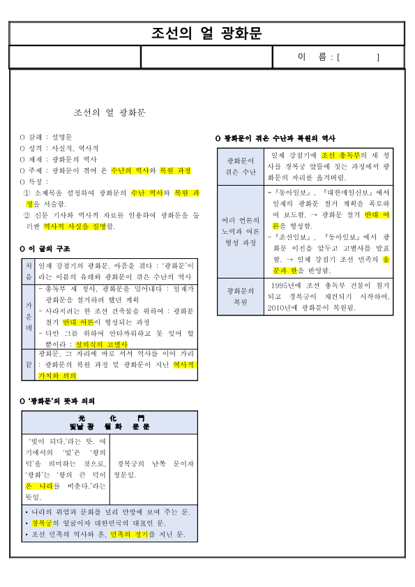 | 끝 | 광화문, 그 자리에 바로 서서 역사를 이어 가리 : 광화문의 복원 과정 및 광화문이 지닌 역사적 가치와 의의 |