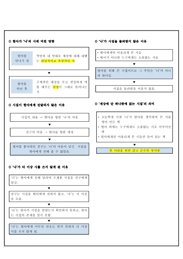 | ‘나’는 현아에게 아무런 반응도 받지 못하자 더 이상 시를 쓰지 않게 됨. |