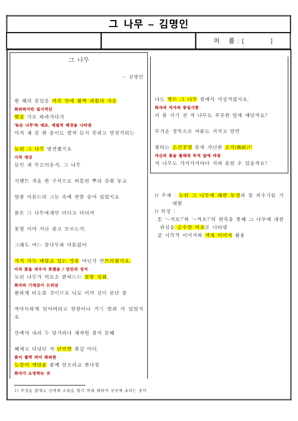 ➀ ‘~지요?’와 ‘~까요?’의 반복을 통해 그 나무에 대한 관심을 순수한 어조로 나타냄