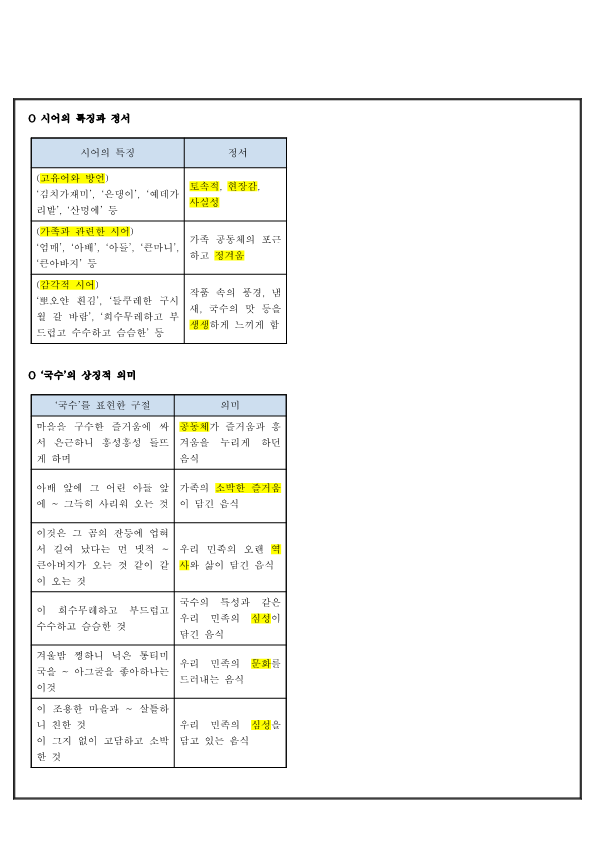 | 2연 | 국수의 특성 : 색깔, 맛, 냄새, 곁들여 먹는 것, 먹는 장소 |