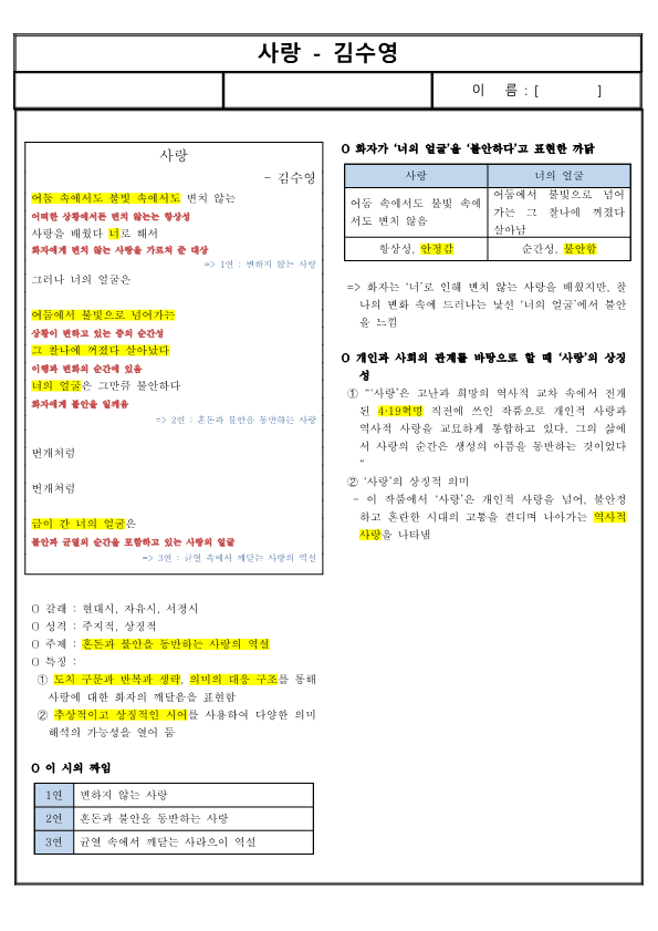 ➀ “‘사랑’은 고난과 희망의 역사적 교차 속에서 전개된 4·19혁명 직전에 쓰인 작품으로 개인적 사랑과 역사적 사랑을 교묘하게 통합하고 있다. 그의 삶에서 사랑의 순간은 생성의 아픔을 동반하는 것이었다“