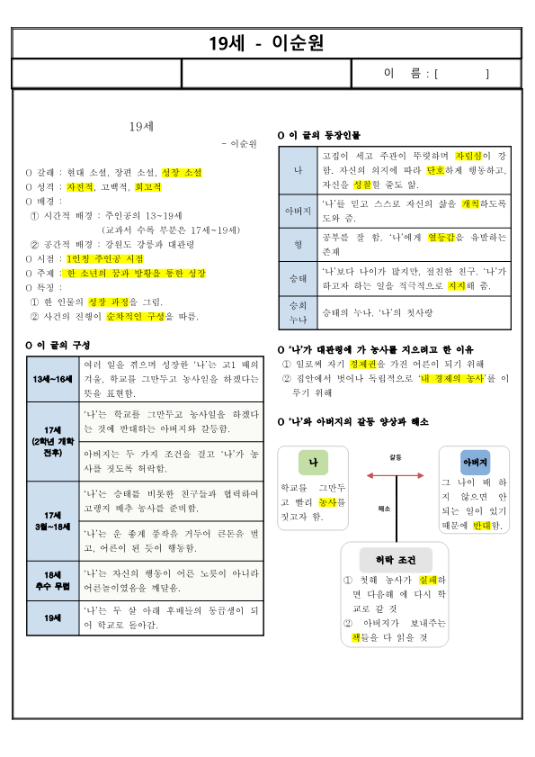 | 17세 3월~18세 | ‘나’는 승태를 비롯한 친구들과 협력하여 고랭지 배추 농사를 준비함. |
