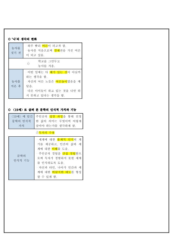 | 농사를 지은 후 | ・어떤 일에는 다 때가 있는 것이 아닐까 하는 생각을 함. ・자신의 어른 노릇은 어른놀이였음을 깨 달음. ・다른 아이들이 하고 있는 것을 나만 하 지 못하고 있다는 생각을 함. |
