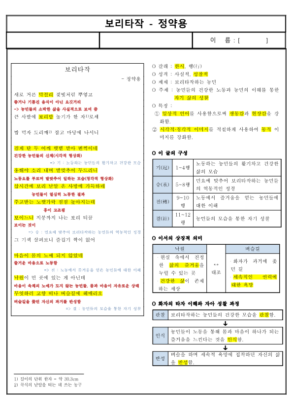 | 승(承) | 5~8행 | 민요에 맞추어 보리타작하는 농민들의 역동적인 정경 |