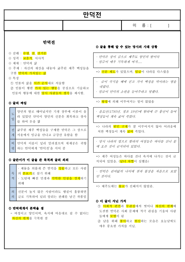 O 주제 : 자신의 재산을 내놓아 굶주린 제주 백성들을 구한 만덕의 가치있는 삶