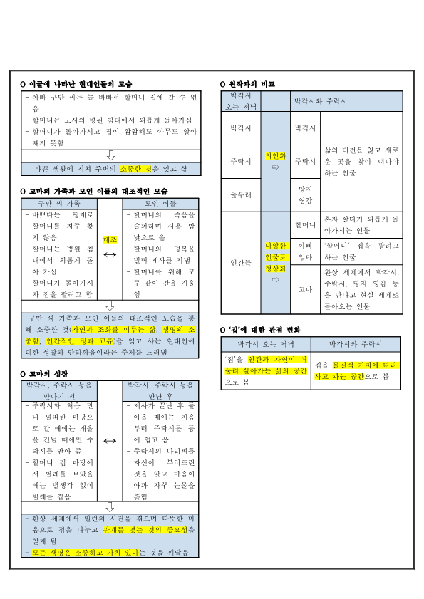 | 낡고 오래되어 물질적 가치가 없어 팔아 버리려는 것 | 할머니 집 | 소중한 이들이 오랜 시간 함께 살며 일구어 온 삶의 터전 | ||